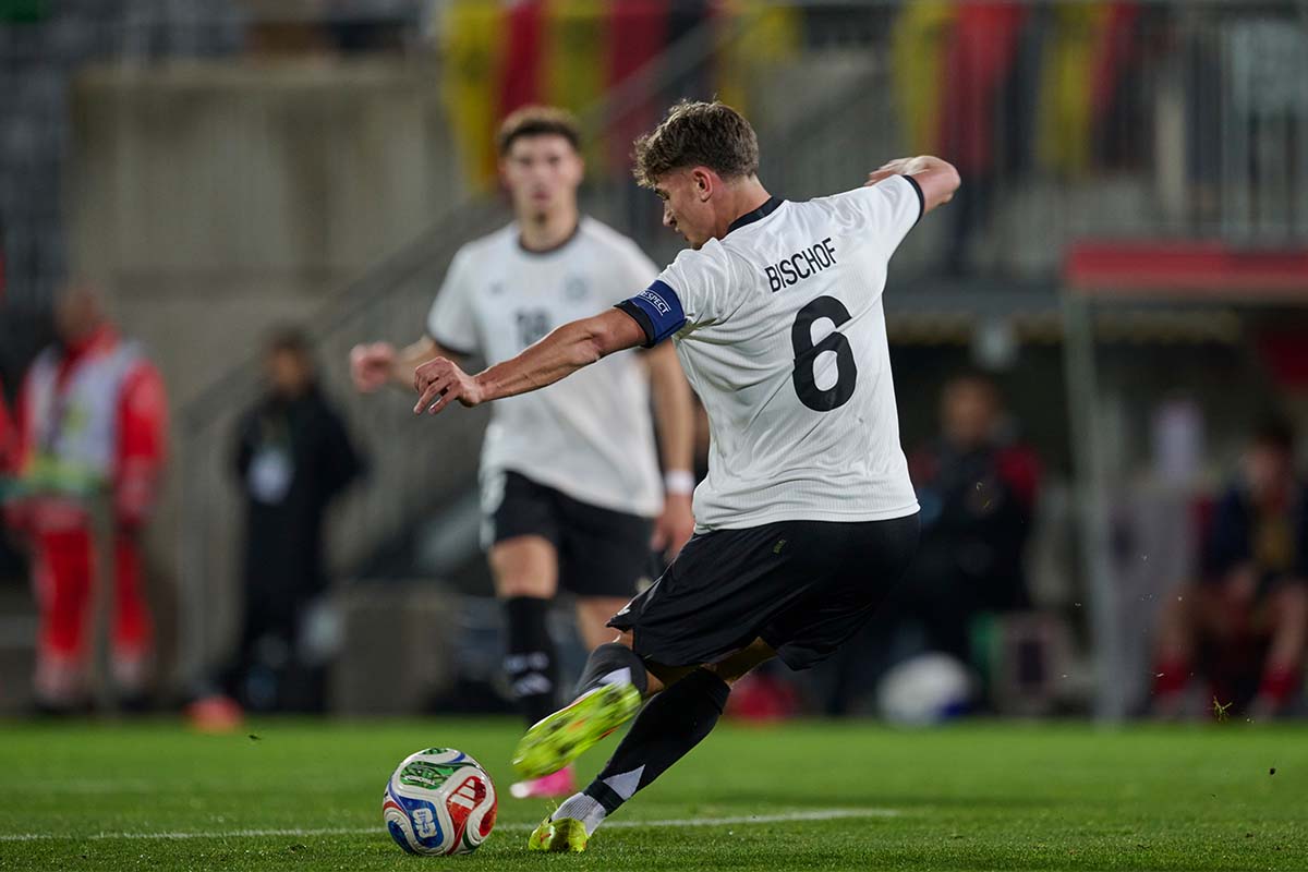 Vor 7729 Zuschauer*innen übernahm die deutsche Mannschaft umgehend das Zepter und bestimmte die Partie. In der 5. Minute wurde es zum ersten Mal torgefährlich, als Kömür Nicolo Tresoldi per Flanke fand – der Kopfball war aus wenigen Metern jedoch zu zentral. Das DFB-Team drückte weiter, sodass der erste Treffer wenige Minuten später folgte. Tom Bischof belohnte die schwungvolle Anfangsphase mit einer starken Einzelaktion: Aus halbrechter Position zog der Kapitän in die Mitte, ließ zwei Gegenspieler stehen und schloss aus gut 20 Metern flach mit links ab – zum 1:0 (9.).